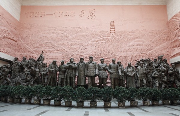 正廳門前兩側,分別有“紅軍長征的落腳點”和“奪取全國勝利的出發點”大型群雕;主體建筑正面兩側有反應地域特色的18孔窯洞造型;大門兩側為“延安是中國民主革命的圣地”、“陜甘寧邊區人民對中國革命的偉大貢獻”的浮雕長卷。