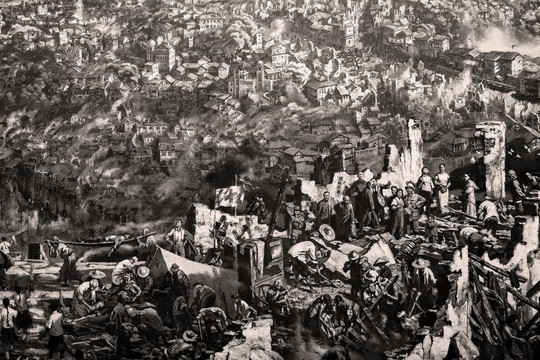 1938年至1943年間日機空襲重慶(含對空監視范圍)203次,出動飛機437批,9166架次,炸、焚毀房屋17452棟,37182間,造成人員傷亡2、5萬余人。其間的1941年6月5日晚,日機24架分三批偷襲重慶,在5個多小時的疲勞轟炸中,渝中區十八梯、石灰市和演武廳(現磁器街)三段防空隧道內,發生了震驚中外、慘不忍睹的避難民眾窒息、踐踏慘案,造成人員傷亡2500人左右。