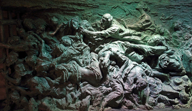 據不完全統計,大轟炸期間,重慶直接人口傷亡超過4萬,財產損失超過100億元(折合1937年法幣)。歷史的傷痕還在,歷史的教訓還在。重慶市民防辦在渝中區磁器街設立了重慶大轟炸慘案遺址紀念設施,遺址屋頂,是一圈擁擠的人物雕塑,人物雙目圓睜,雙手抓破衣服,扯裂喉嚨,撕心裂肺般張口吐舌,這表現的便是“六五”大隧道慘案中的慘狀。
